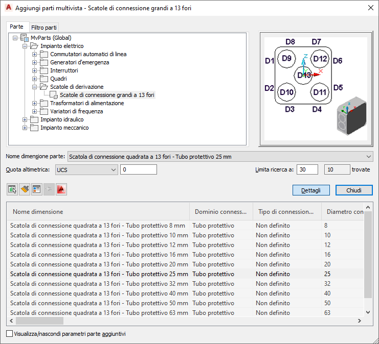 Nella scheda Filtro parti disponibile nelle finestre di dialogo Aggiungi parti multivista e Modifica parte multivista è inoltre possibile specificare le proprietà parte per cercare una dimensione parte specifica all'interno di una famiglia di parti. Per visualizzare le dimensioni parte disponibili in una famiglia di parti è sufficiente fare clic su Dettagli: le dimensioni parte disponibili vengono presentate in una tabella di facile esplorazione. Selezionare Visualizza/nascondi parametri parte aggiuntivi per visualizzare tutti i parametri della tabella.