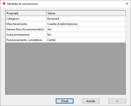 Nota: Questo modello di conversione rappresenta il meccanismo tramite cui vengono specificati i valori di default per le impostazioni dello script di conversione creato. Dopo aver creato lo script, è possibile personalizzare le impostazioni in base alle esigenze.