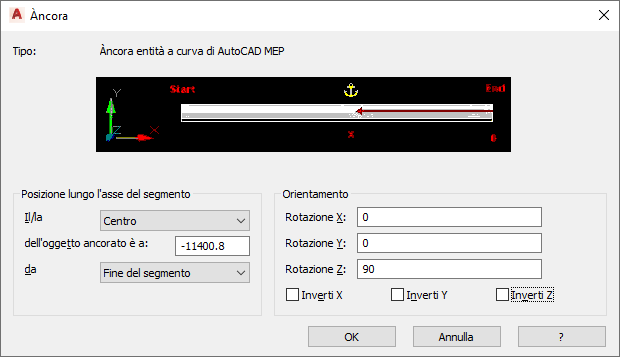 Un'àncora collega un oggetto di AutoCAD MEP 2027 toolset ad un altro oggetto o ad una curva o griglia di layout. Nel dominio Tubature questo foglio di lavoro è valido per raccordi che utilizzano ancore (ad esempio le deviazioni). Nel dominio Schemi il foglio di lavoro è valido per i simboli. È possibile visualizzare e modificare i punti di inserimento X, Y e Z relativi al sistema di coordinate corrente e all'angolo di rotazione dell'àncora. Gli oggetti ancorati possono essere riposizionati lungo un segmento di asse specificando una posizione quotata o invertendo l'ancora rispetto all'asse X,Y o Z. La scheda Àncora è disponibile solo dopo aver collegato oggetti con uno strumento àncora.