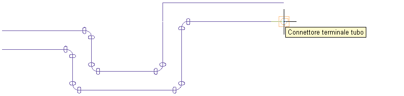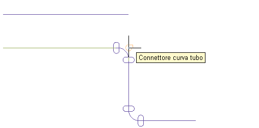 Osservare che per i raccordi a gomito e altri raccordi curvi viene visualizzato un connettore curva tubo sulla linea di intersezione logica delle linee d'asse del raccordo. Ciò consente di eseguire l'offset tubo alla distanza specificata lungo l'intero tratto parallelo.