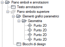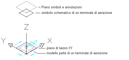I simboli schematici per le parti parametriche vengono creati nel piano simboli e annotazioni, un piano orizzontale al quale si associa una geometria di simbolo nonché vincoli, quote e annotazione associate.