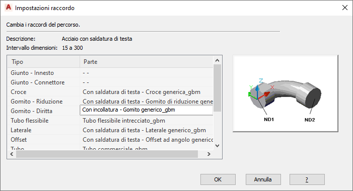 Quando si sostituisce una parte di default, questa rimane attiva fino al termine del comando Aggiunta tubo. Alla successiva aggiunta di tubi, verrà riutilizzata la parte di default nella preferenza di percorso.