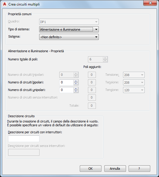 | Generale o Altro | In Numero di circuiti, immettere il numero di circuiti da creare. |