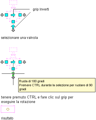 Le parti, le deviazioni e i raccordi ruotati connessi ad altri oggetti vengono regolati automaticamente al fine di mantenere la connettività. Ad esempio, a seguito dell'inversione di un raccordo, è possibile che vengano apportate lievi modifiche alla lunghezza dei segmenti di tubo connessi. Se non è possibile regolare gli oggetti mantenendo la connessione, questa viene interrotta.