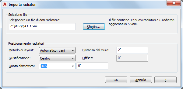 È possibile aggiungere radiatori ad un disegno utilizzando i dati di un file XML creati tramite un programma di calcolo del riscaldamento, ad esempio SOLAR COMPUTER Desktop. Il file XML contiene un identificatore per uno o più vani del modello. Ogni identificatore vano del file è seguito dall'elenco di radiatori da posizionare nel vano.