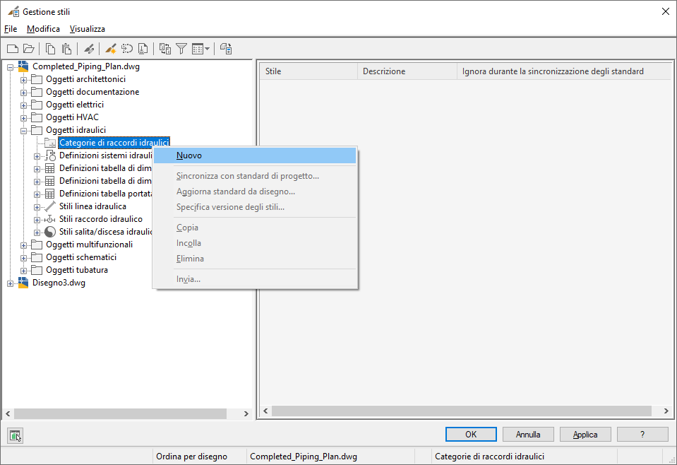 È possibile creare categorie per vari oggetti MEP, ad esempio dispositivi, quadri, simboli schematici e raccordi idraulici. Nei passaggi seguenti viene illustrato come suddividere in categorie uno stile per raccordi idraulici.