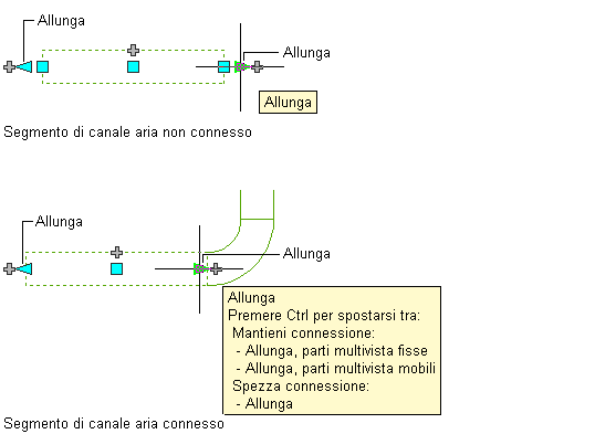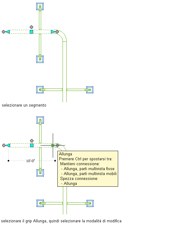 Quando si utilizza il grip Allunga su un'estremità connessa ad un altro oggetto, è necessario specificare se AutoCAD MEP 2027 toolset deve mantenere la connettività tra gli oggetti in seguito alla modifica della lunghezza.