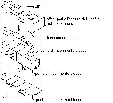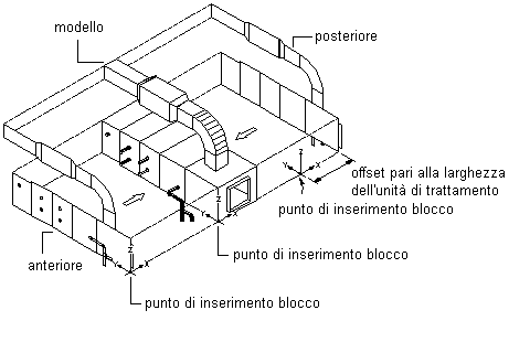Nelle figure precedenti il punto di inserimento della vista modello è situato nell'angolo destro del bordo inferiore del lato anteriore. Per le viste dall'alto e dal basso il punto di inserimento si trova nell'angolo destro del bordo anteriore, con l'offset del punto di inserimento vista dall'alto in base all'altezza dell'unità di trattamento dell'aria. Per le viste dall'alto e dal basso il punto di inserimento si trova nell'angolo destro del bordo anteriore, con l'offset del punto di inserimento vista dall'alto in base all'altezza dell'unità di trattamento dell'aria. Per le viste sinistra e destra il punto di inserimento si trova nell'angolo anteriore in basso, con l'offset del punto di inserimento vista sinistra in base alla lunghezza dell'unità di trattamento dell'aria.