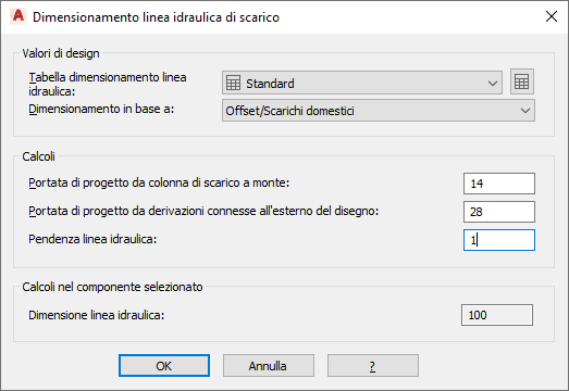 - In Valori di design, per Dimensionamento in base a selezionare Offset/Scarichi domestici.