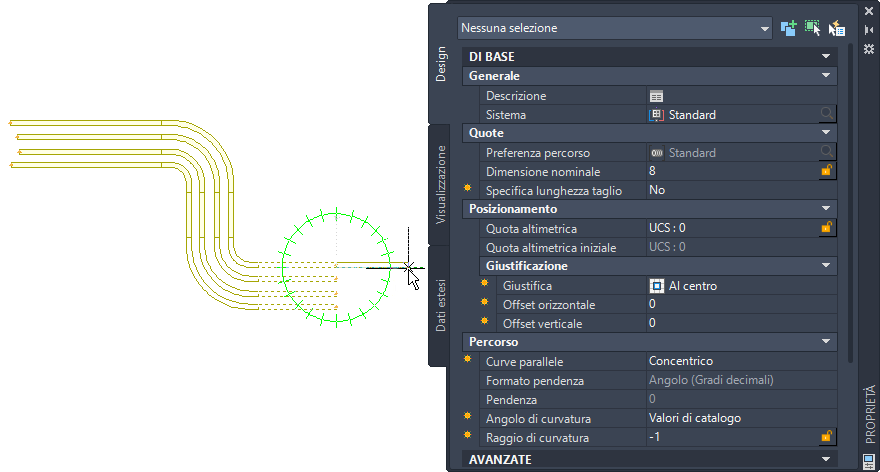 Nel riquadro proprietà sono disponibili due opzioni per la configurazione di curve parallele: Concentrico e Raggio fisso. Tali opzioni consentono di specificare il tipo di raggio di curvatura da utilizzare in un tratto di tubi protettivi paralleli.