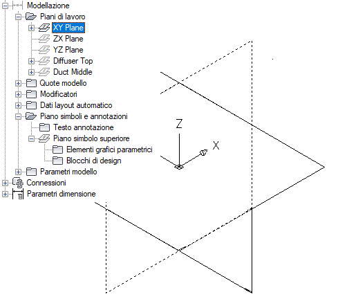 Vengono creati i piani di lavoro piano ZX, piano YZ e piano XY.