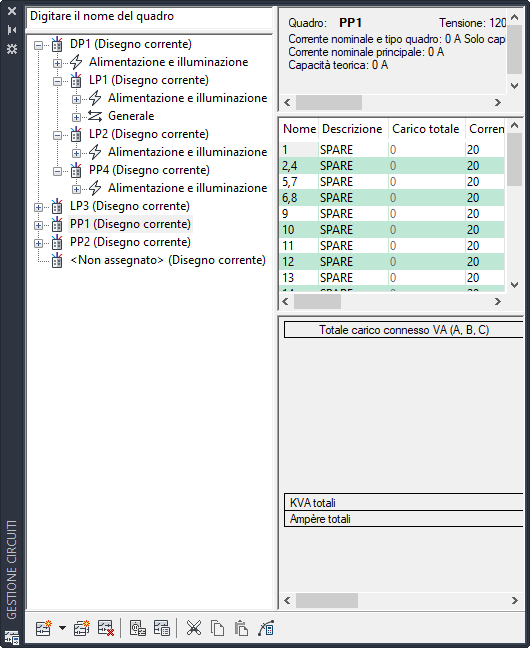 Dopo aver collegato i quadri, utilizzare Gestione circuiti per trasferire la richiesta di carico del quadro e i carichi totali connessi per ogni categoria di carico da un quadro ad un altro.