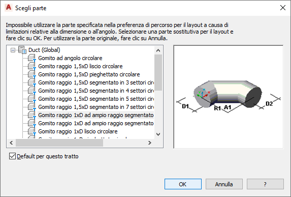 La finestra di dialogo Scegli parte viene visualizzata se si tenta di aggiungere o modificare una parte in un tratto non memorizzato nelle preferenze. Verrà richiesto di effettuare una sostituzione dal catalogo. Nell'esempio riportato di seguito viene illustrata la finestra di dialogo del dominio Rete di canali aria nel profilo Globale: