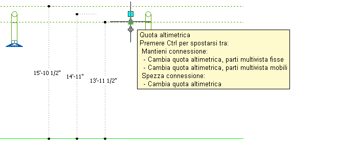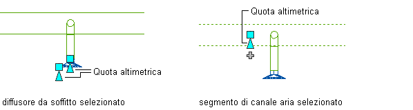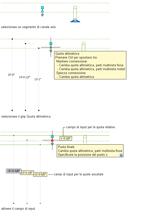 ) consentono di modificare la quota altimetrica delle parti multivista HVAC e dei segmenti di canale aria durante la connessione degli stessi a tratti di canale aria esistenti nelle viste laterali e assonometriche. I grip Quota altimetrica per le parti multivista HVAC vengono visualizzati in corrispondenza dei punti di inserimento e dei punti connettore. I grip Quota altimetrica per i segmenti di canale aria consentono di modificare la quota altimetrica relativa alla parte superiore, alla linea d'asse o alla parte inferiore del segmento.