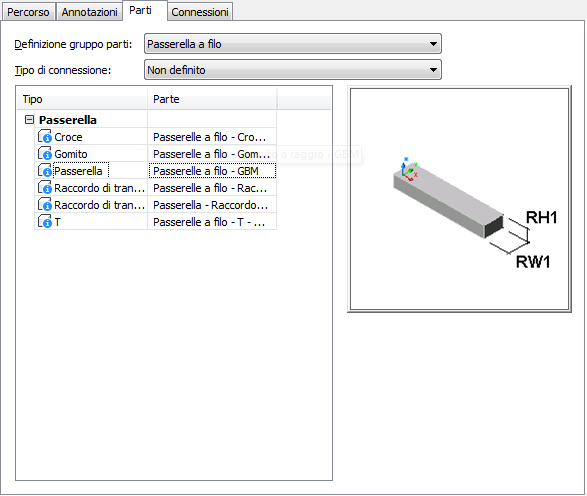 Per specificare le parti e i raccordi da inserire automaticamente durante il disegno di tratti di passerelle, attenersi alla procedura descritta di seguito.