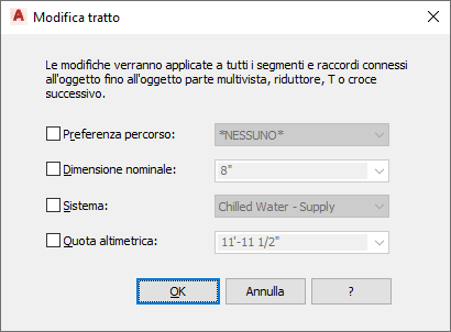 una o più proprietà (preferenza di percorso, dimensione nominale, sistema e quota altimetrica), quindi specificare il tipo di modifica nell'elenco corrispondente.