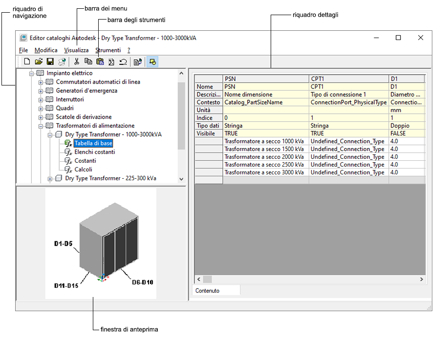 L'interfaccia utente dell'Editor cataloghi è suddivisa in due riquadri ridimensionabili, un riquadro per la navigazione e un riquadro per i dettagli, e dispone di una barra dei menu, una barra degli strumenti e una finestra dell'immagine di anteprima.