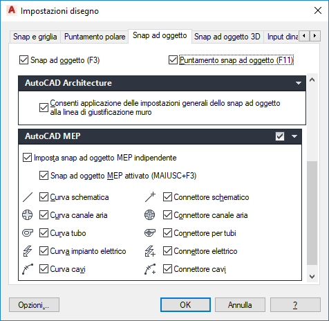 Suggerimento: Per attivare o disattivare gli snap di AutoCAD MEP 2027 toolset, premere la combinazione di tasti MAIUSC+F3.