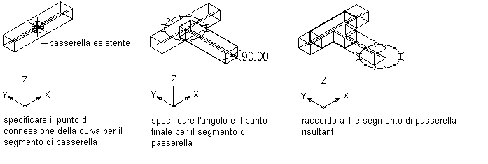 Per aggiungere passerelle e tubi protettivi ad un disegno, è necessario tracciare i tratti principali dopo aver individuato le colonne montanti, Quando si disegnano tratti di passerella o tubo protettivo, il layout della geometria dei percorsi dei fili viene creato mediante la specifica di punti nel disegno. Vengono aggiunti automaticamente raccordi per connettere i segmenti durante la creazione di un tratto oppure per connettere i tratti alle colonne montanti e alle derivazioni durante la creazione di una rete (layout automatico). È inoltre possibile aggiungere raccordi manualmente.