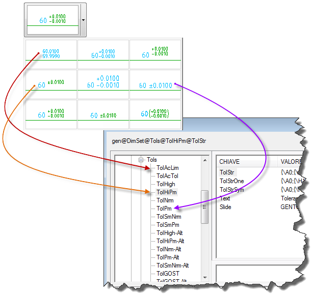 Le anteprime delle tolleranze nell'elenco a discesa Tolleranza corrispondono alle prime otto voci della sezione Acad/M > DimSet > Tols dell'editor di sistema. I nomi di tali voci iniziano con "Tol", ad esempio TolHigh. Le voci rimanenti si riferiscono alla rappresentazione dell'unità alternativa per le tolleranze e hanno nomi che terminano con "-Alt". Ad esempio, TolHigh-Alt è la rappresentazione dell'unità alternativa di TolHigh.