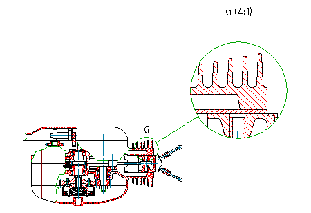 - Visualizza una linea di connessione tra il bordo di dettaglio e il contorno della vista di dettaglio. In aggiunta, visualizza un bordo attorno alle viste di dettaglio e imposta linee di taglio levigate sui modelli visualizzati nelle viste di dettaglio.