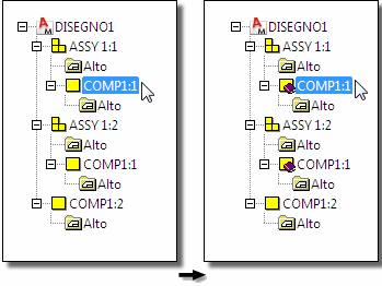 Questo esempio mostra un disegno contenente due istanze dell'assieme ASSY1; ASSY1:1 e ASSY1:2. COMP1 è presente sia all'interno (COMP1:2) che all'esterno (COMP1:1) di ASSY1. Se si seleziona COMP1:2 in ASSY1:1 e lo si rende un componente di riferimento, anche COMP1:2 in ASSY1:2 diventa un componente di riferimento, poiché esistono due istanze di COMP1:2, una in ASSY1:1 e una in ASSY1:2. Tuttavia, l'istanza COMP1:1 non diventa un componente di riferimento.