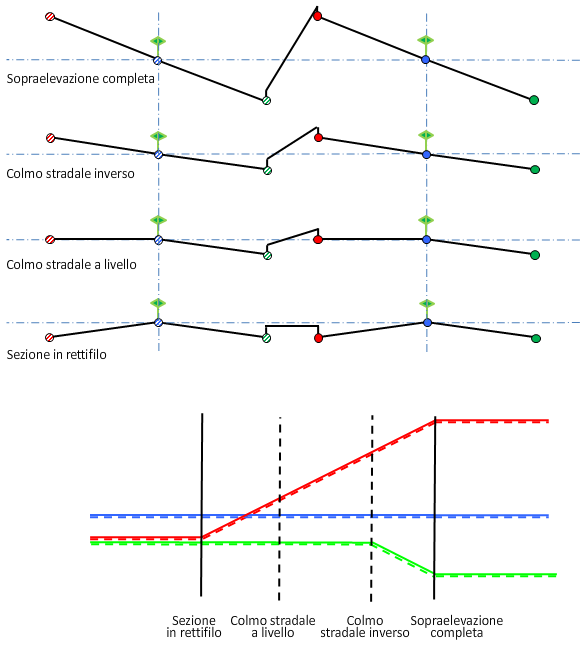 Nell'illustrazione che segue è rappresentato il metodo di rotazione Centri per una sezione stradale a doppia falda e doppia carreggiata.