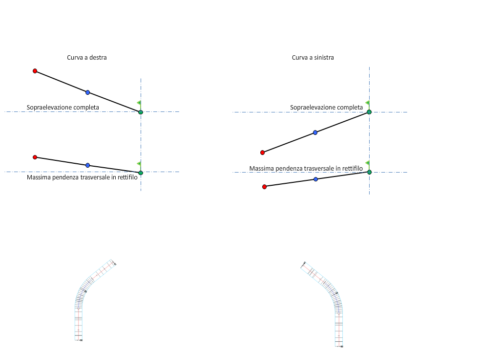 Nell'illustrazione che segue è rappresentato il metodo di rotazione Lato destro per una sezione stradale a singola falda e unica carreggiata.