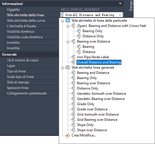 È possibile accedere a Composizione stile etichetta dalla tavolozza Proprietà di AutoCAD, è altresì possibile selezionare l'opzione Crea/Modifica nel menu a discesa degli stili disponibili. Nel controllo Stile etichetta, scegliere Modifica selezione corrente.