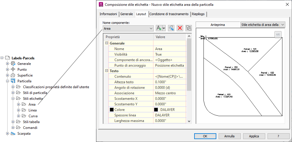 Le etichette dell'area della particella vengono visualizzate nella Carta come mostrato nell'anteprima della finestra di dialogo Composizione stile etichetta