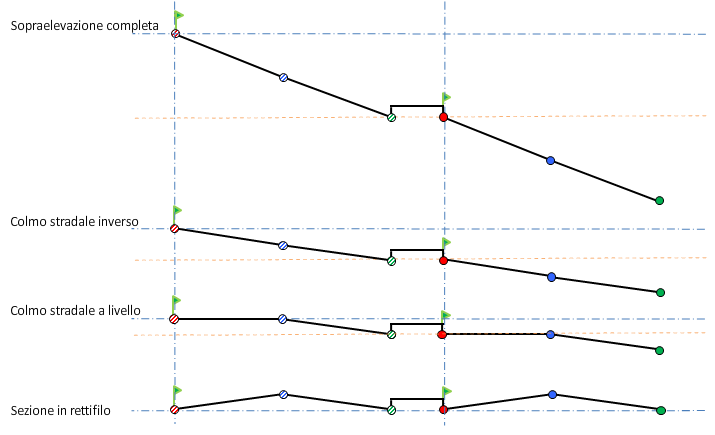 Nell'illustrazione che segue viene mostrata una strada a doppia carreggiata come tipo di modellatore e una forma di sezione trasversale a doppia falda su ciascun lato. La sezione stradale è sottoposta alla rotazione della falda esterna opposta durante la sopraelevazione: