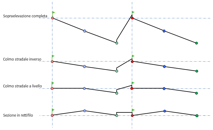 In questa sezione vengono descritte situazioni relative a strade a doppia carreggiata e viene illustrata l'applicazione della sopraelevazione in ogni specifica situazione.
