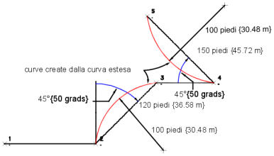 | raggio | Distanza da un punto centrale alla curva. Immettere questo valore nelle unità di distanza correnti del database rilievi. Utilizzare un raggio negativo per disegnare la curva in una direzione antioraria (verso sinistra). |