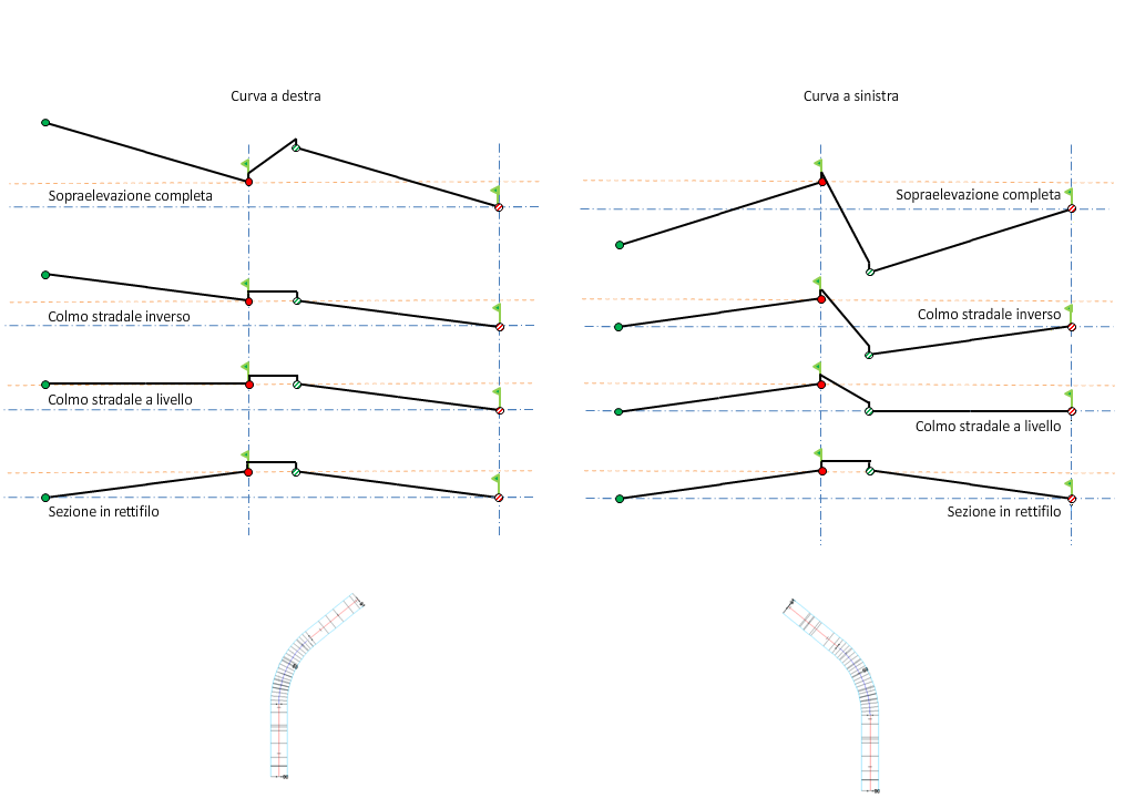 Nell'illustrazione che segue è rappresentato il metodo di rotazione Lato destro per una sezione stradale a singola falda e doppia carreggiata.