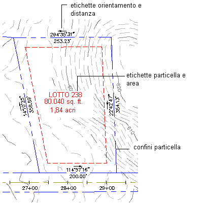 Ogni particella presenta un'etichetta di area, che si riferisce alla particella come insieme. Fare clic sull'etichetta dell'area per selezionare la particella. Una particella può presentare anche etichette dei segmenti (lati) e relative tabelle, che visualizzano informazioni sulla particella stessa. Le etichette possono contenere campi di proprietà definiti dall'utente.