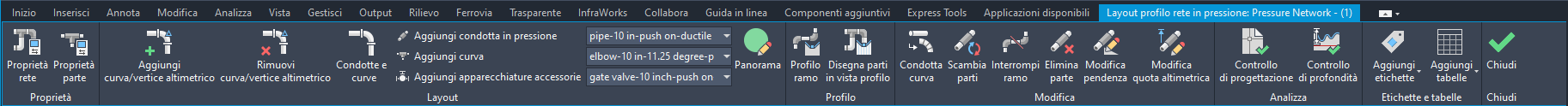 Utilizzare la barra multifunzione Layout profilo rete in pressione per lavorare con reti in pressione nella vista profilo.