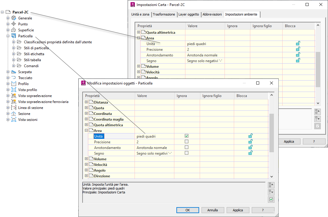 Il segno di spunta nella colonna Ignora della finestra di dialogo Modifica impostazioni oggetti - Particella (finestra di dialogo inferiore) indica che il valore impostato in questa finestra di dialogo sostituisce l'impostazione ad un livello superiore.