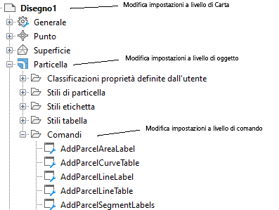 Al livello comando, questa finestra di dialogo contiene anche impostazioni specifiche dei comandi, come le impostazioni Particelle e Tracciati, che vengono utilizzate con il comando CreateSite.