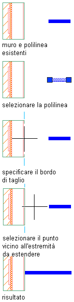 Estendere una o più linee, polilinee aperte o archi fino al bordo implicito di un segmento retto o ad arco di un oggetto o fino ad un'estensione implicita dello stesso.