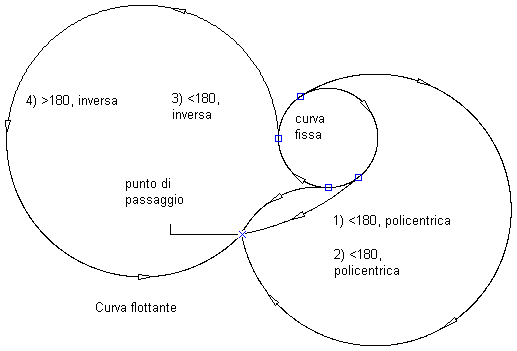 Nell'illustrazione che segue vengono mostrate una curva di continuità flottante collegata ad una curva e quattro possibili soluzioni per un raggio e un punto di passaggio specifici, nonché variabili per angoli maggiori e minori di 180° e variabili di continuità e di flesso: