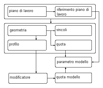 Nell'illustrazione che segue vengono mostrati gli oggetti che compongono il modello. Le frecce indicano la direzione della relazione tra gli oggetti. Ad esempio, la modifica della geometria ha conseguenze su un profilo, la cui modifica influisce a sua volta su un modificatore e così via. Mano a mano che si acquisiscono informazioni su ogni oggetto, fare riferimento a questa illustrazione per comprendere meglio le relazioni tra gli oggetti.