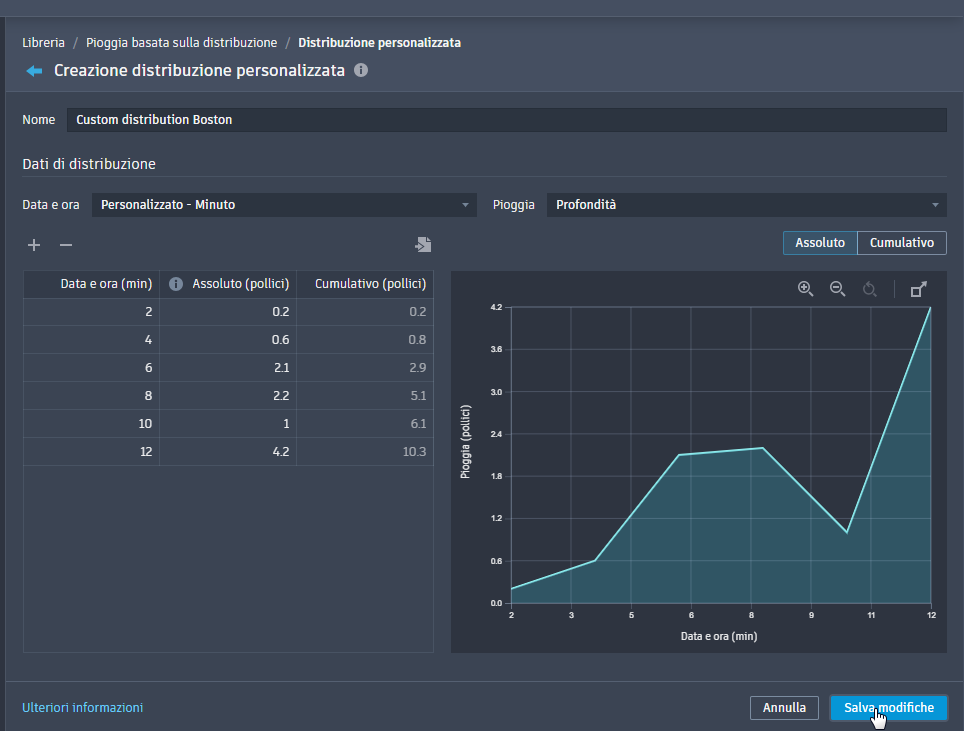 Nota: I valori di intensità e profondità non vengono utilizzati direttamente nell'analisi delle precipitazioni. La percentuale di precipitazioni in corrispondenza di ogni fase temporale viene invece calcolata dividendo la profondità totale dell'evento per la distribuzione ad ogni intervallo.