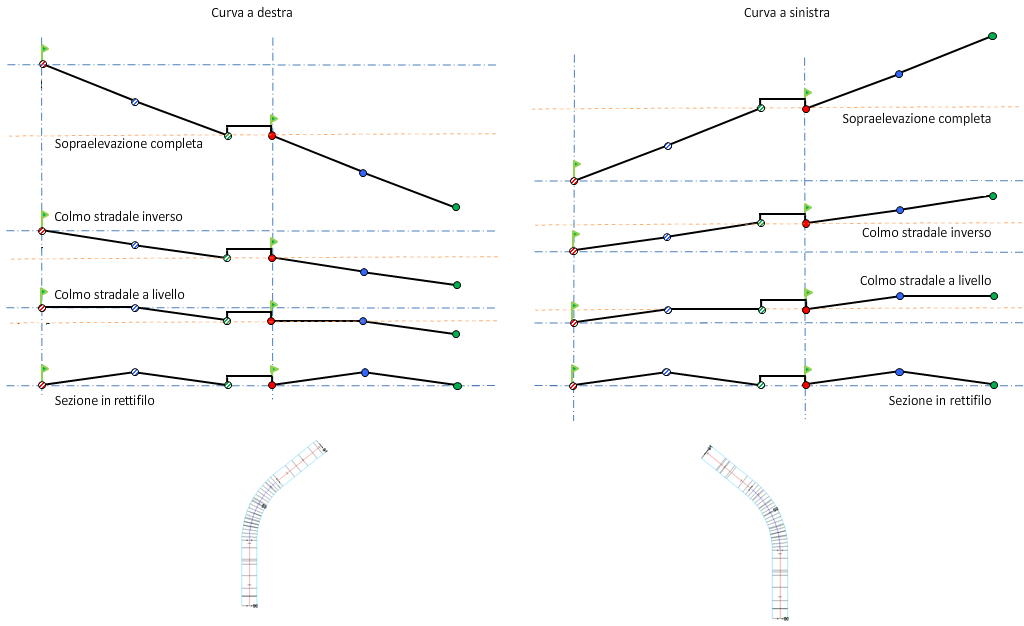 Nell'illustrazione che segue viene mostrato il metodo di rotazione lato sinistro per una sezione stradale a doppia falda e doppia carreggiata.