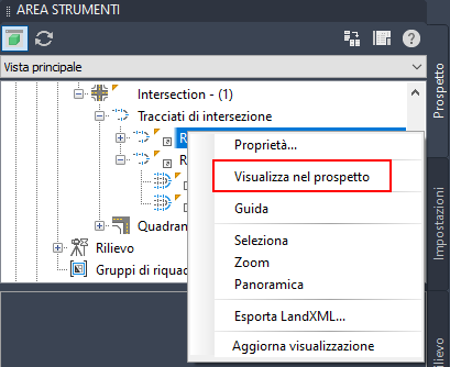 Un altro oggetto disponibile nella raccolta Tracciati di intersezione è il comando Visualizza nel prospetto.