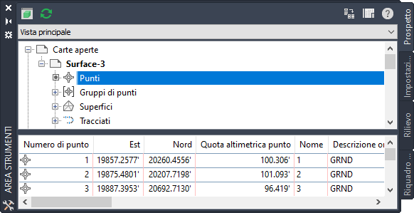 Una vista elenco è una tabella visualizzata dalle strutture dell'Area strumenti per alcuni elementi. In alcuni casi queste informazioni possono essere modificate. Nella seguente figura è illustrata una vista elenco di punti nella scheda Prospetto: