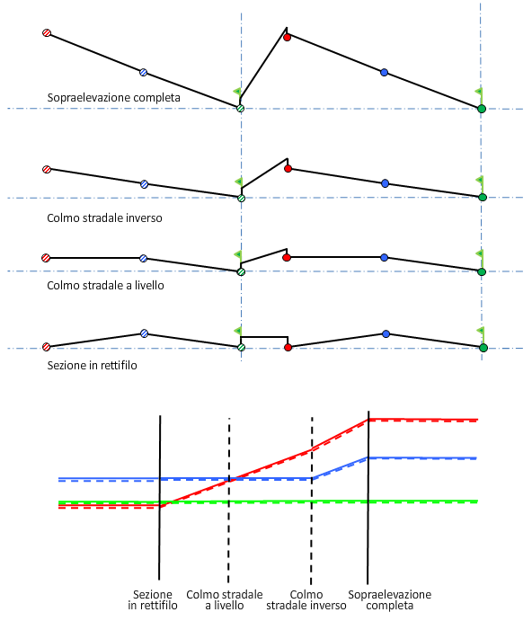Nell'illustrazione che segue viene mostrato il metodo di rotazione All'interno della curva per una sezione stradale a doppia falda e doppia carreggiata.