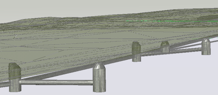 Immagine di rendering di un oggetto superficie che simula erba e bacini di raccolta e condotte di drenaggio in calcestruzzo sottostanti.