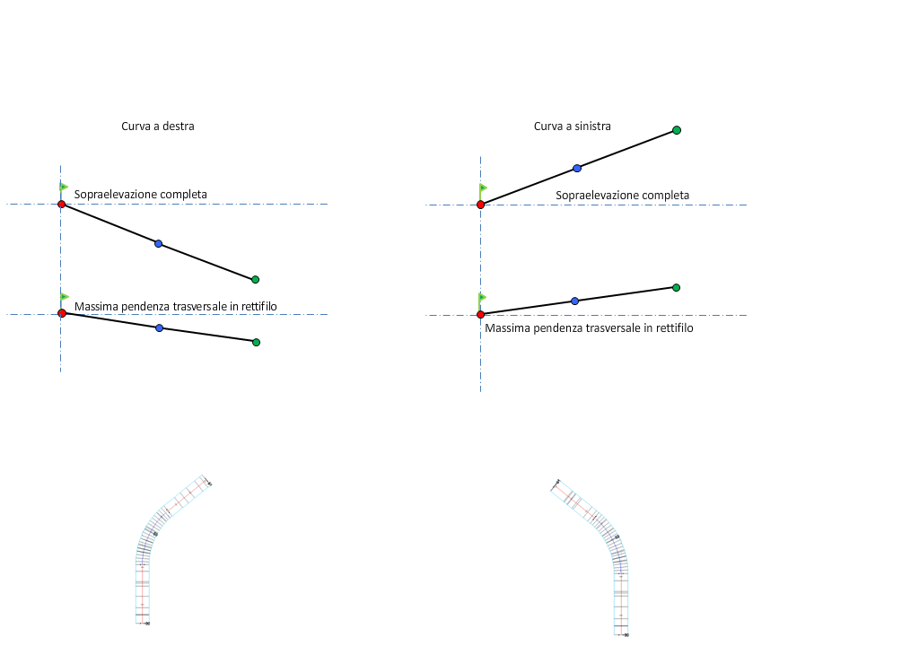 Nell'illustrazione che segue è rappresentato il metodo di rotazione Lato sinistro per una sezione stradale a singola falda e unica carreggiata.