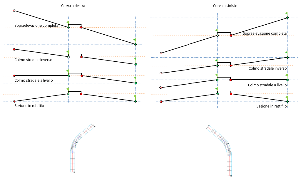 Nell'illustrazione che segue è rappresentato il metodo di rotazione Lato destro per una sezione stradale a singola falda e doppia carreggiata.