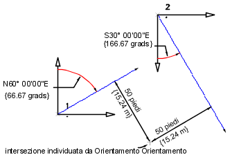 Un'intersezione viene posizionata tra un orientamento di N66.6667"E disegnato dal punto 1, con una distanza di scostamento di 50 piedi a destra e un orientamento di S33.3333"E disegnato dal punto 2 con una distanza di scostamento di 50 a destra.